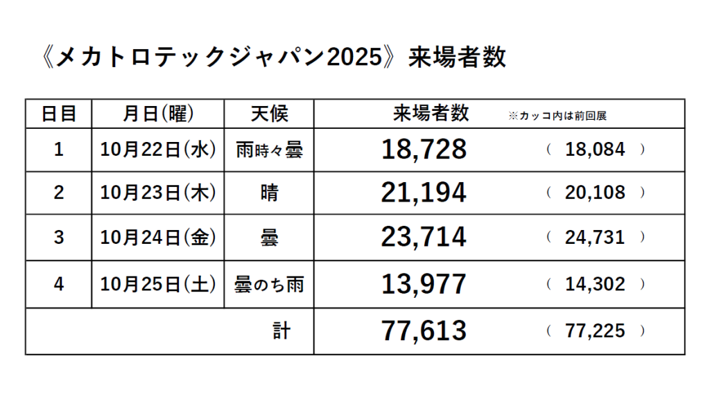 メカトロテックジャパン(MECT)2025はおかげさまで大盛況のうちに終了いたしました。4日間の来場者数は77,613人(前回展は77,225人)となりました。