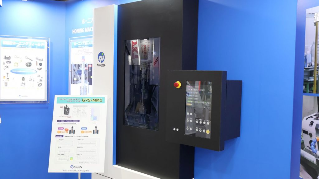 日進ProSOL(日進プロソル、1E18)は中径ホーニング盤「G75-MM1」を紹介する。加工径は50mm~80mm。砥石(といし)の拡張方法を、張り出し量と張り出し圧の2種類で切り替えられ、粗加工と仕上げ加工を工程集約できる。これまで小径のホーニング盤がメインだったが、同製品で新規開拓を狙う。
