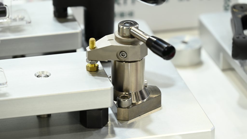 イマオコーポレーション(3E08)は工具なしでクランプできるワンタッチクランプシリーズの「クサビロックタイプ」を展示している。レバーを回すとカチッとクリック感があるため、クランプの完了が分かりやすい。
