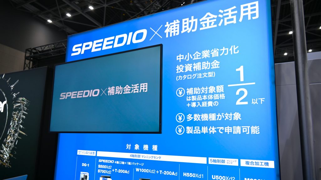 ブラザー工業(1F02)は小型工作機械「SPEEDIO(スピーディオ)シリーズ」の展示に加え、補助金を活用した設備投資についても提案した。「中小企業省力化投資補助金(カタログ注文型)」を使えば製品本体価格と導入経費の約2分の1が補助対象額となる。
