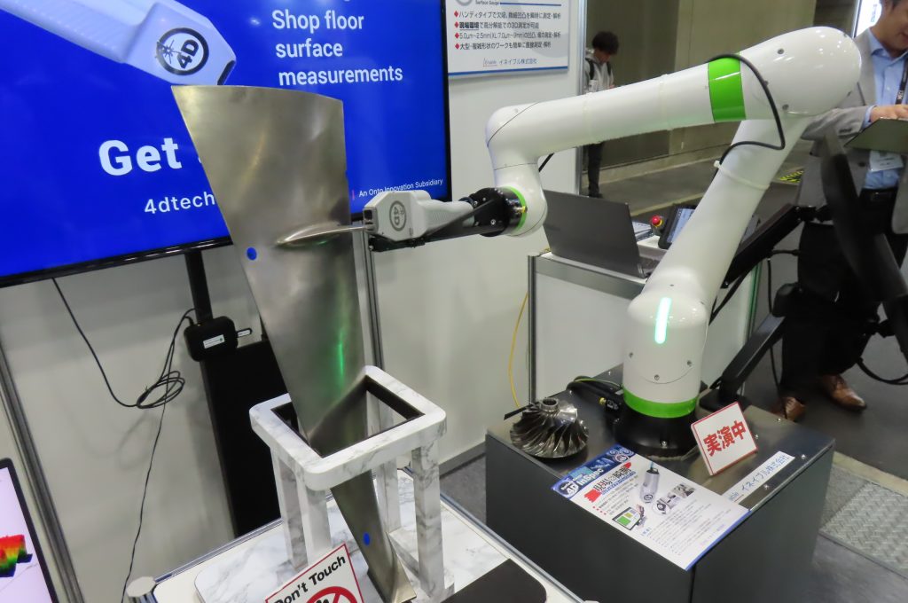 イネイブル(3D04)は、ワーク表面の微細な凹凸や傷を高分解能で測定するハンディータイプの非接触表面測定機「4D InSpec(インスペック)」を、協働ロボット先端に搭載して展示する。「高精度な表面測定を手軽に自動化できると、多くの来場者に興味を持ってもらった」と小川雄也取締役営業本部長は言う。