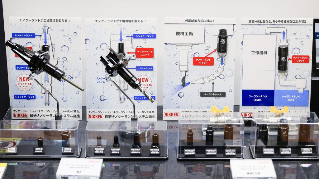 日研工作所(2D16)が提案するナノクーラントは、水溶性クーラントの匂いを抑えたり、作業者の手荒れを防ぐ。クーラントの交換頻度を削減する効果もある。ツーリングメーカーとしてツーリングに搭載するのはもちろん、外部給油のクーラントホースや配管につなぐことで、旋盤や研削盤などさまざまな工作機械でナノクーラントを利用することができる。切削加工に携わる人や工場に優しい技術として、来場者の関心を呼んでいる。