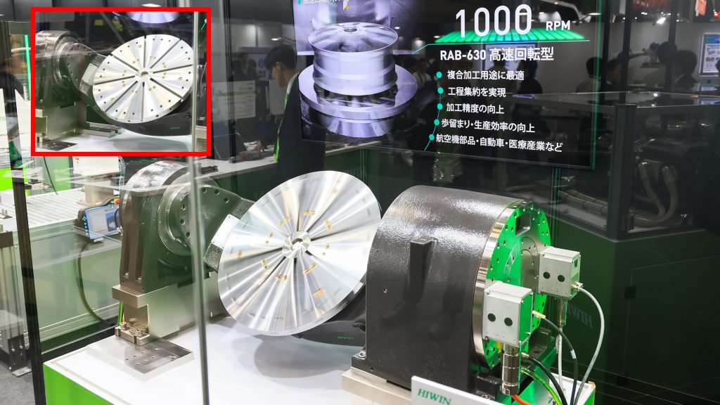 ハイウィン(3F04)は、大型工作機械向けに、大型でありながら高速回転に対応する傾斜円テーブル「RAB-630」を展示する。許容荷重は350kgで、毎分1000回転の高速回転を実現。展示製品は直径630mmで、最大1200mmまでラインアップする。写真はシャッタースピード800分の1秒での撮影だが大きくぶれており、速さがよく分かる。