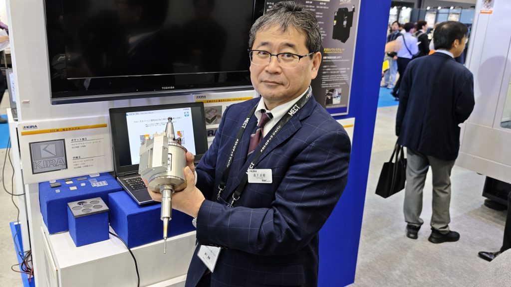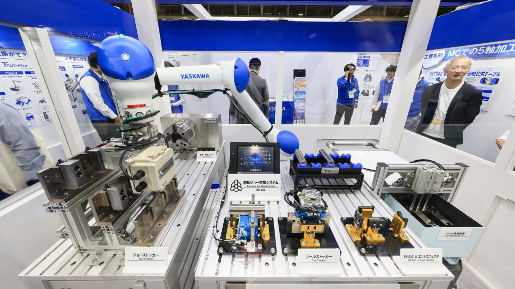 ユキワ精工(2C25)は「ワークハンドリングホルダ」で、部品加工現場の自動化を提案する。ツールホルダーをワークの搬送用途としてデザイン。工作機械内にワークストッカーを設置し、ワークの供給・排出を自動化できる。前回のMECTでは主軸テーパーBT30番タイプを披露したが、今回展ではその後発売した同40番タイプをアピールする。「ロボットなどよりも安価で効果的な自動化を提案する」と担当者は話す。