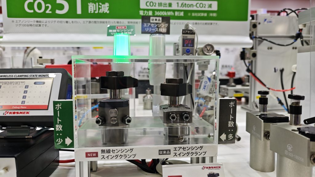 コスメック(3D32)はクランプ機器の新製品「無線センシングクランプ」を展示。クランプの状態をエアでなく無線で検知できる。エアポートを別途用意する必要がなくなるため、工作機械内部での干渉のリスクやエア消費量を抑えられる。また、応答時間は0.1秒とエアを使った従来機器よりも早くなった。