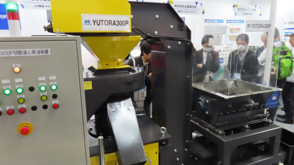 機械工具商社の共和工機(3C05)は、自動切りくず脱油機/切りくず処理装置「YUTORA(ユトラー)」(=写真)、移動式スラッジ・浮上油回収装置「スラッジバキューマー」、高圧クーラント装置「ハイプレッシャークーラントユニット」のプライベート商品3つを披露する。いずれも省エネや自動化などのキーワードにつながる商品だ。ブースには常に多くの来場者が訪れ、技術説明員と熱心に話し込んでいる。