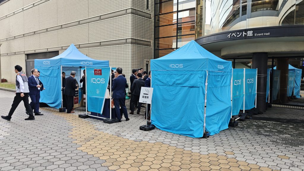 第1展示館とイベント館前の喫煙所ではフィリップモリスの加熱式たばこ「IQOS(アイコス)」の体験会と販売をしております。