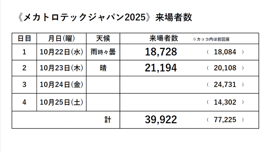 会期2日目の10月23日(木)の来場者数は21,194人でした。会期3日目となる本日のポートメッセなごや周辺の天気は曇りです。開催時間は2日目までと同様、午前10時~午後5時です。皆さまのご来場をお待ちしております。