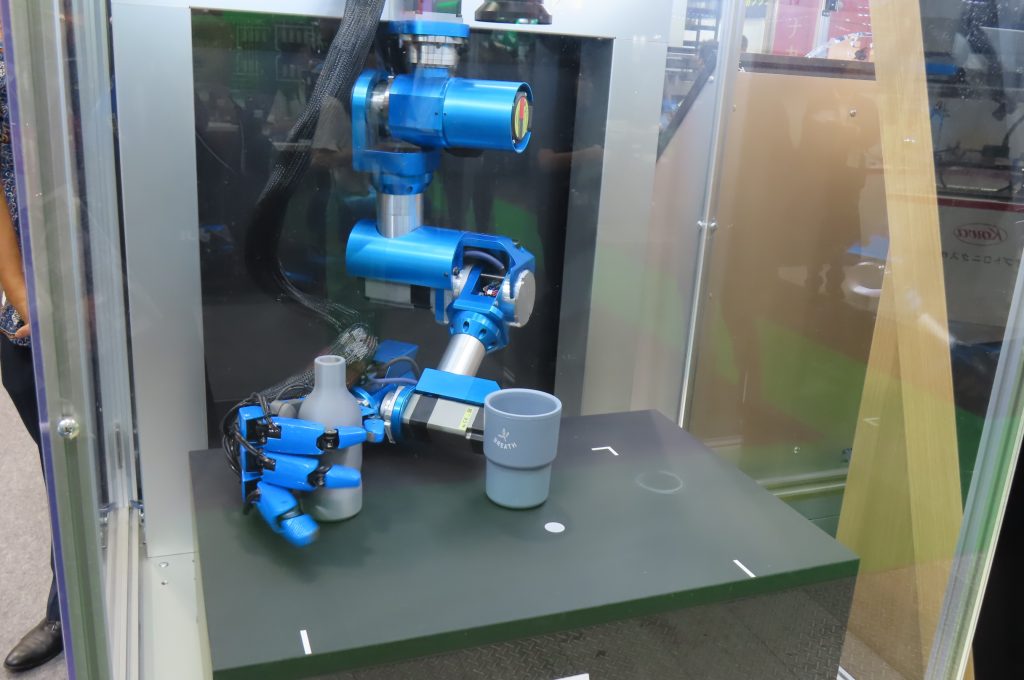 ハーモニック・ドライブ・システムズ(3B48)のブースでは人の手の形のロボットハンドを展示し、ボトルをつかんでカップに注ぐ動作など披露する。手首や指の各関節に同社の小型減速機を組み込んでおり、滑らかな動きをアピールする。その他、ラインアップを拡充した小型減速機「CSF-mini(ミニ)」の新製品なども展示する。