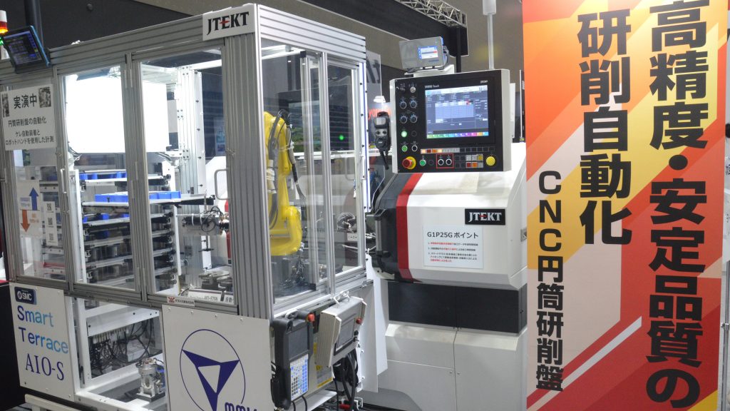 ジェイテクト(1C32)は、労働力不足や熟練技能の継承といった課題に対し、さまざまなソリューションを提案する。労働力不足の解決に向けては、CNC円筒研削盤「G1P25G」と松本機械工業(3E28)のロボットシステム「Smart Terrace(スマートテラス)」を提案。ワークの着脱やケレ交換などを自動化でき、夜間や週末の無人運転を可能にし、生産性向上に貢献する。説明員は「高精度かつ安定した品質での研削の自動化を実現する」と話す。