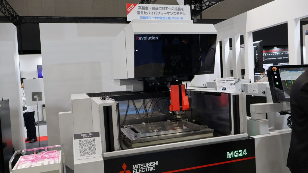 三菱電機(1A04)は新たにワイヤ放電加工機「MGシリーズ」を開発し、ブースにスタンダードモデルと高精度モデルの2機種を並べる。同社独自の人工知能(AI)技術「Maisart(マイサート)」を搭載しており、ノズルとワークとの距離の変化に応じて加工条件を補正する機能、自動結線機能などを備える。高橋宣之放電システム部長は「誰でも簡単に扱え、止まらずに加工し続けられる上、省エネにもこだわって開発した」と語る。