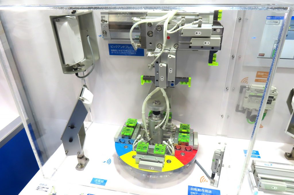 SMC (3F03)は「省力化のアップデート提案」をテーマに、これまでよりさらに一歩進んだ省力化を提案する。その一つが今年発売した「無線オートスイッチ」だ。オートスイッチはシリンダーのロッド位置を検出するセンサーで、有線方式が一般的だが、同製品は給電も通信も無線化した。配線のためのスペースや手間が不要で断線やケーブル劣化による故障リスクをなくせる。