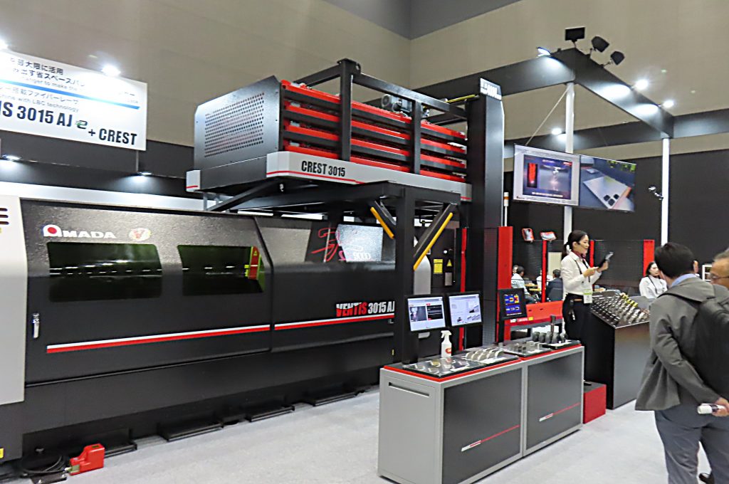 アマダ(1F04)は「自動化との出会いが、モノづくりの未来を変える」を掲げ、自動化ソリューションを複数展示する。レーザ加工機に取り付ける「CREST(クレスト)3015」は板金材料の保管スペースを加工機の上に設けた省スペースな自動化機器で、「自社展以外に出すのはこれが初」(展示会担当者)。その他、ベンディングマシンを自動化するための協働ロボットシステムなども提案する。