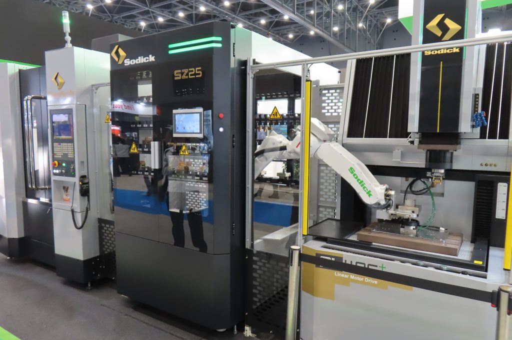 ソディック(1D25)は形彫り放電加工用のワークと電極をストックできるロボットシステム「SZ25」を会場で初披露している。放電加工機と電極加工用マシニングの間に置けば、電極の製作から放電加工までを一気通貫で自動化できる。「ロボットの最大可搬質量を従来の12kgから25kgに高めており、より重いワークやジグにも対応しやすくなった」と技術説明員は語る。