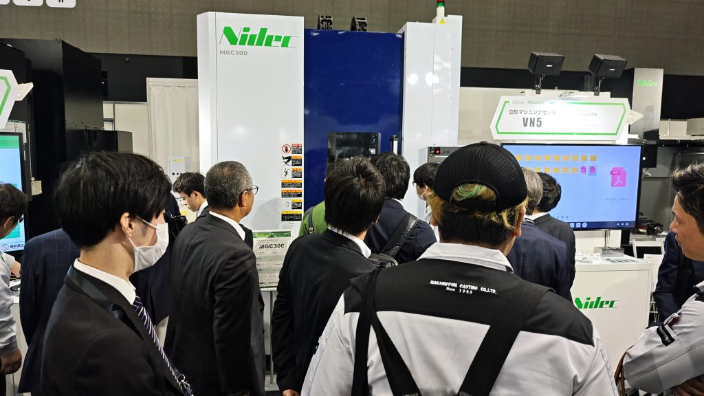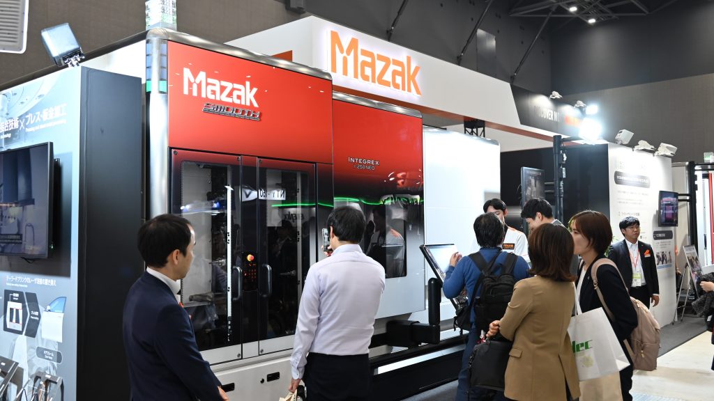 ヤマザキマザック(1B40)は新発売の複合加工機「INTEGREX(インテグレックス) i-250 NEO(ネオ)」を出展した。ミーリング主軸の見直しで高剛性化を図り、加工能力を高めた。また、旋削・ミーリング主軸ともに冷却機能を高めたり、各駆動軸のボールねじに温度センサーを搭載したりして、熱変位の影響を抑制できる点をアピールした。