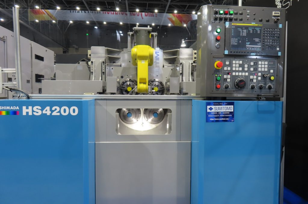 シマダマシンツール(1C29)は「ローディングによるロスタイム“ゼロ”」を提案する。4主軸2刃物台の旋盤「HS4200」では、2つの主軸で2製品を同時加工し、その間にロボットで残りの2主軸へのワーク脱着やワーク反転を行う。「加工条件やローディング速度を変えなくても、頑張らずにサイクルタイム短縮ができる機械」と担当者は話す。
