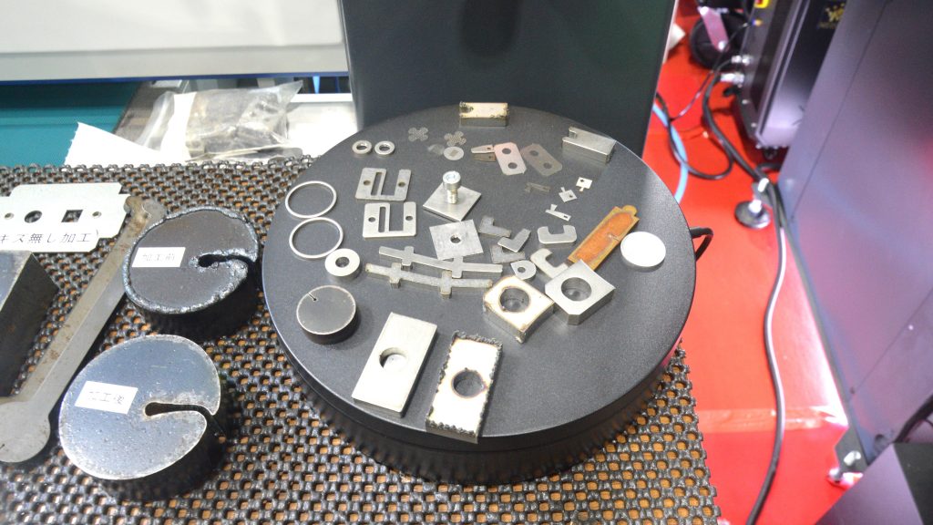 ブレス(3A01)は、ドイツに本社を構える「LOEWER(ルーベル)」のバリ取り機「ルーベル・ディスクマスター」などを展示する。同機は従来のバリ取り機では対応が難しかったレーザー加工やガス溶断などで発生する溶接焼け(レーザードロス)やスパッタの除去、R面取り加工を1台で行える。北原伸浩社長は「1円玉サイズの小物部品から厚さ100 mmの厚物まで加工できる」とサンプルワークを披露する。