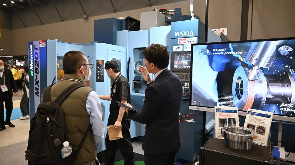 松浦機械製作所(1C13)は5軸複合マシニングセンタ「MX-520T PC7」を日本で初めて出展する。搭載できるパレット数を従来の4枚から7枚に増やした新開発の「タワーパレットシステムPC7」をオプションで選択できる。
