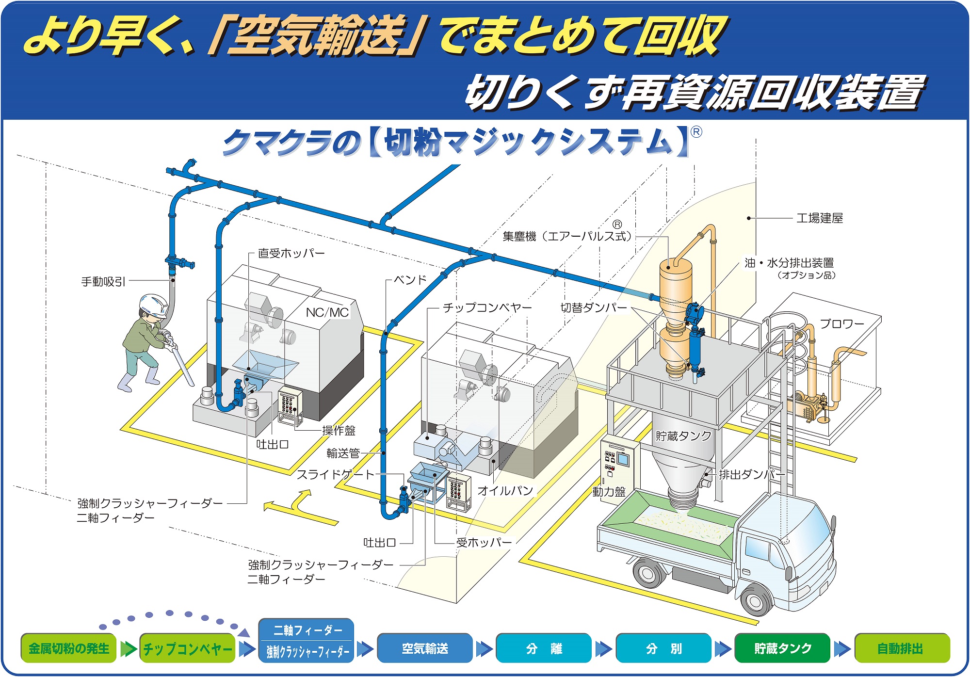 今回のブースでは、空気輸送設備はもちろんのこと、このシステムのノウハウを活かし開発した「切粉マジックシステム」も紹介している。このシステムは、工作機械から出る切粉(線状・カール状)を空気輸送しやすい形状に破砕し、遠距離集積所に輸送する事も出来る。また、切粉と油水が分離補捉でき、ピット、コンベアを必要とせず機械の再配置の自由度も高く、環境改善にも寄与するまさに未来志向の装置である。