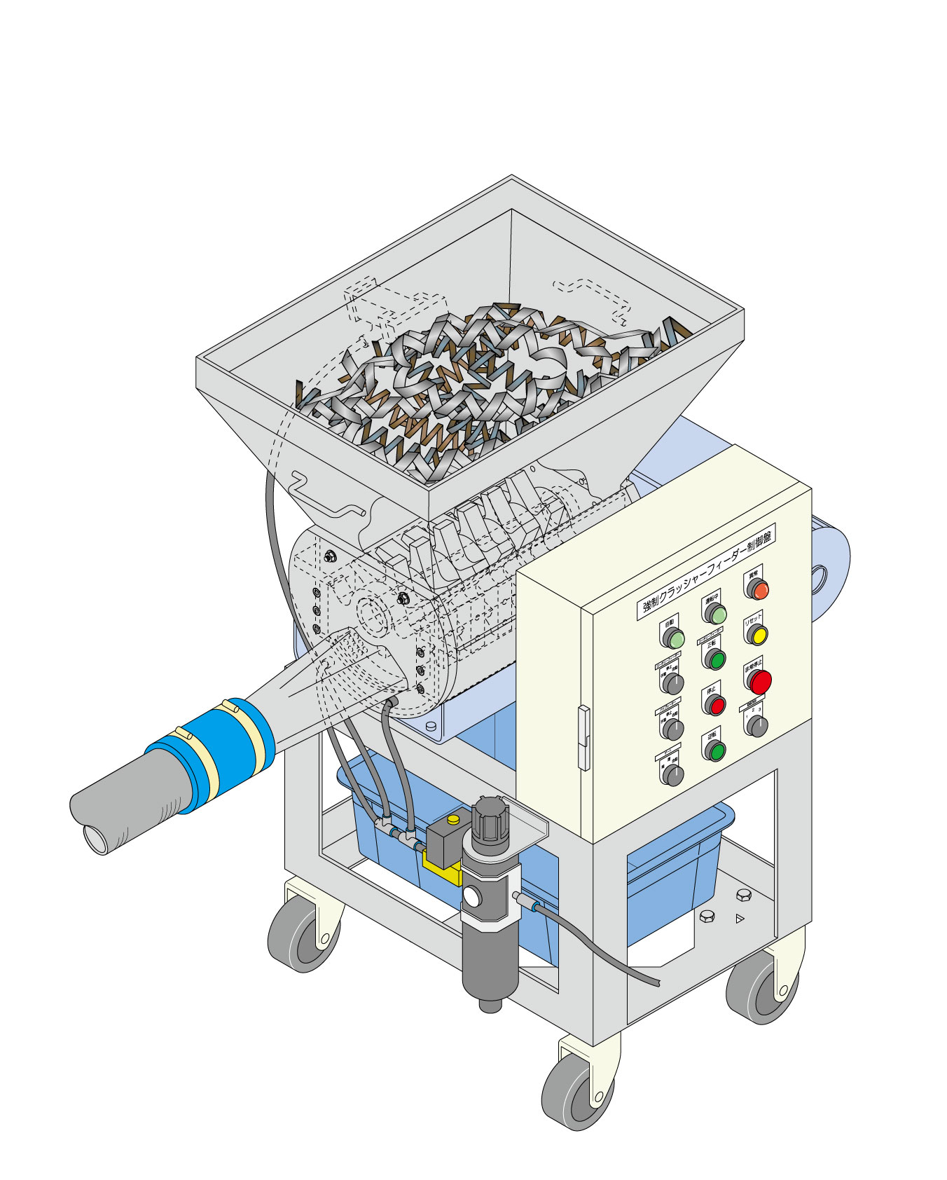 工作機械から加工時に出る切粉が、受けホッパーに溜まると稼働し、形状・大きさに関係なく切粉を空気輸送可能なチップ状にする破砕機。