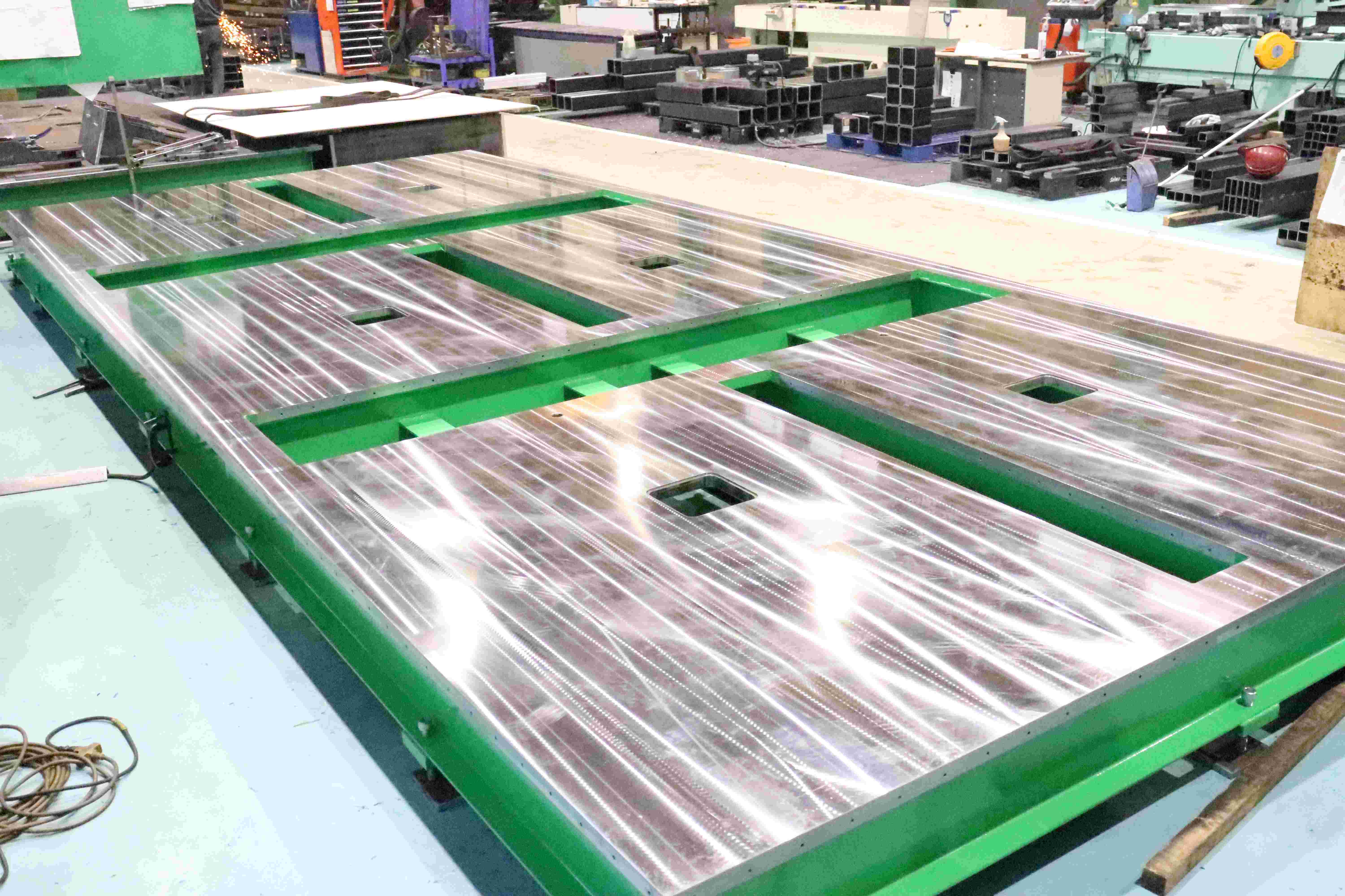 独自に製作した精密溶接定盤を使用して仮組、溶接、歪取りを行っています。 仮組時に利用することで、直角・対角をしっかりと出すことができ、熱による縮みを考慮した仮組が行えます。