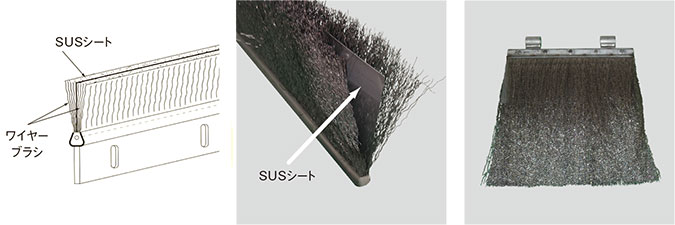 「ワイプレシール」はブラシの間にSUSシートを挟み込み、高温域でもシール性を維持。冷気や熱気の流入・放出を防ぎ、耐熱・耐摩耗性にも優れ、遮熱・防塵・防水用途に対応します。