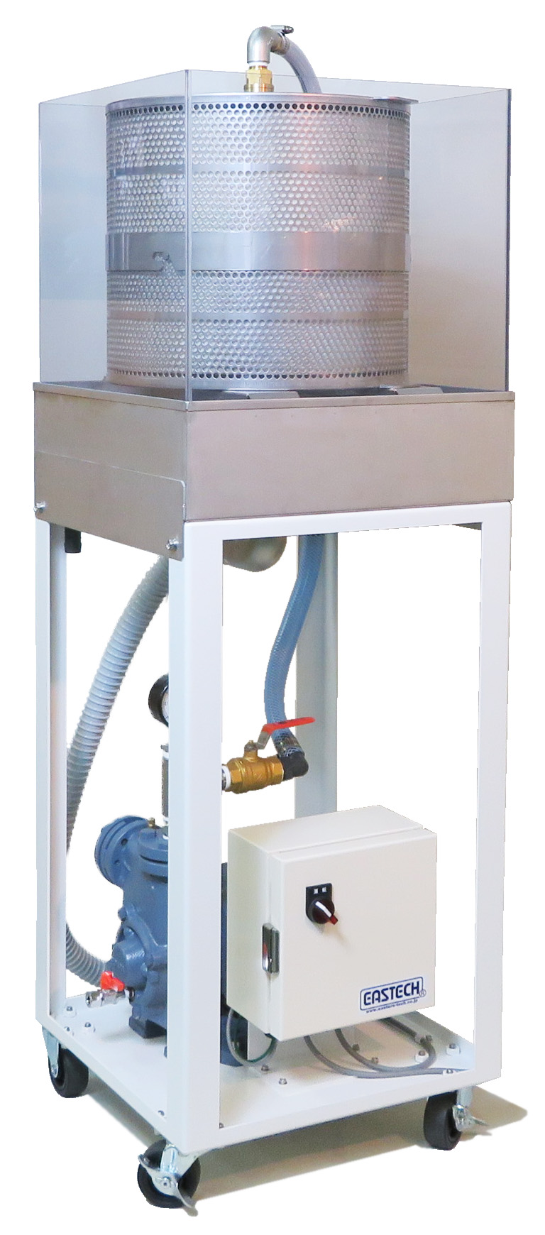 当社メカトロ事業部の新装置コンテナボックス(通い箱)洗浄乾燥機「イーステックエアドライヤ」は、乾燥力を体感できる実験機を用意。高性能ノズルのパワーを実感できる。
