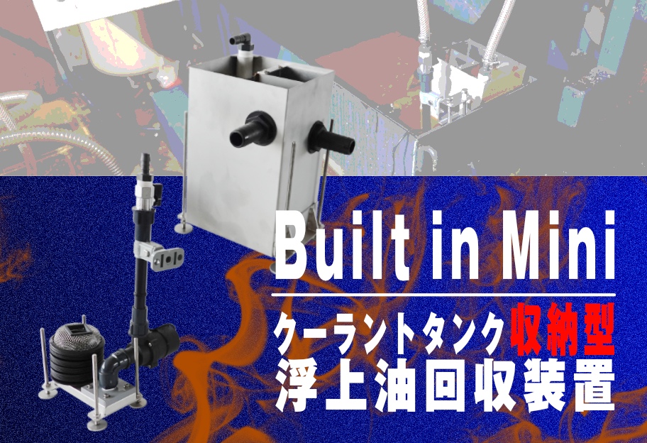 クーラントタンク内にも収納ができる超小型浮上油回収装置。吐出量6リットル/分の高性能ポンプを採用し、浮上油を高速回収。「クーラント液の劣化防止」、「悪臭防止」などで活用。