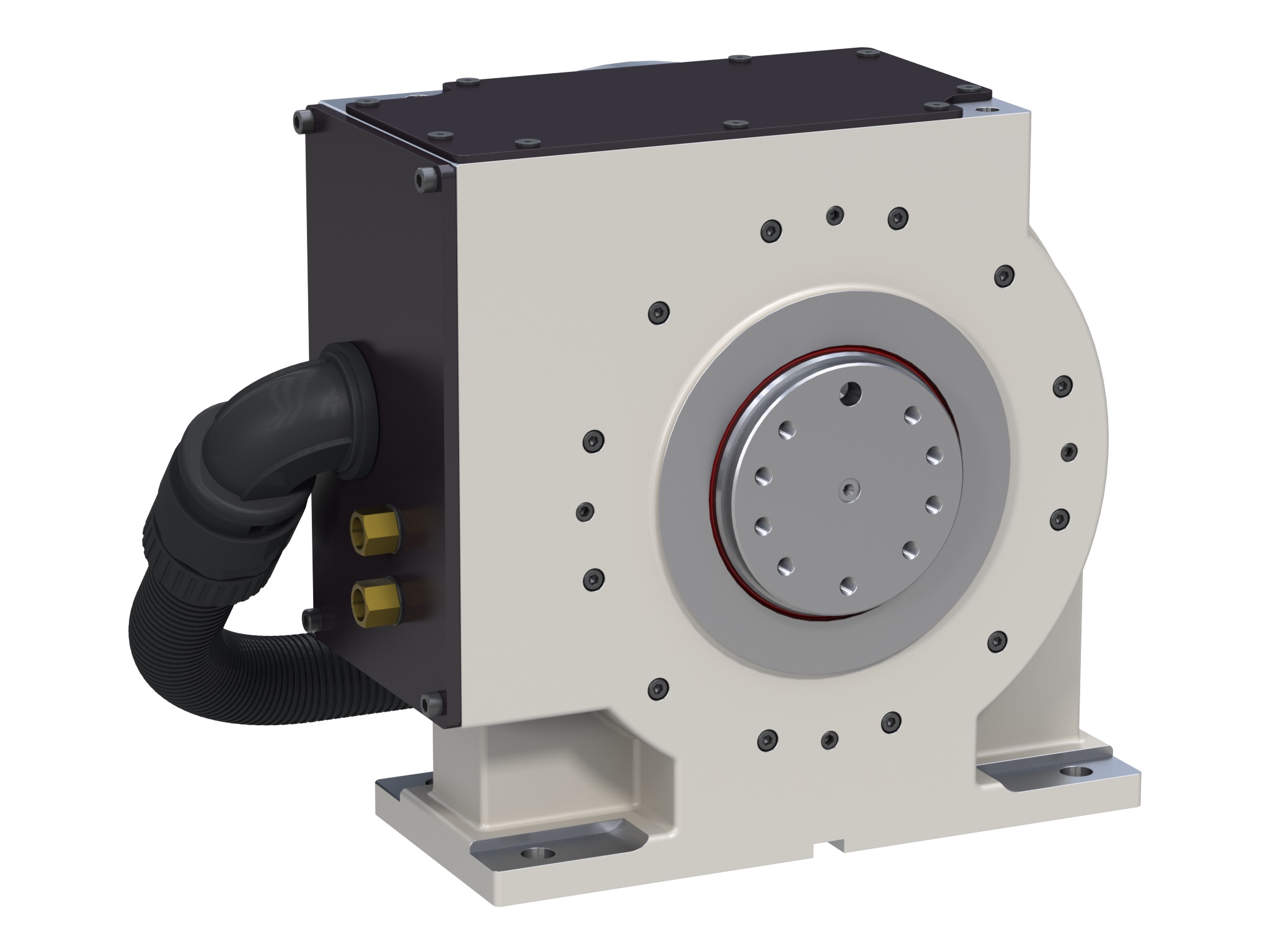 ダイレクトドライブ(DD)モータ駆動のNC円テーブル。 DDモータによる高速割出が可能