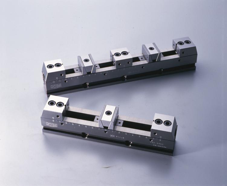 高精度セレーション付き汎用自在バイス。ワークに合わせて口金を位置決めすることで、1個から多数個クランプが可能。クサビ機構により浮き上がりも抑えられる。