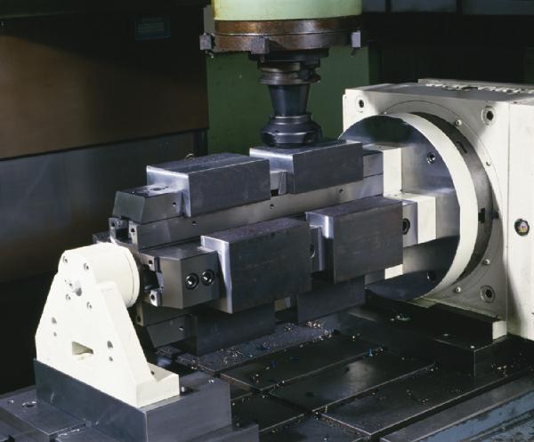PSSシリーズを4面にセッティングした4面バイス。円テーブルで設置して使用する事で、最大16個ワーククランプ可能。横形MCの4面イケールバイスとしても使用可能。