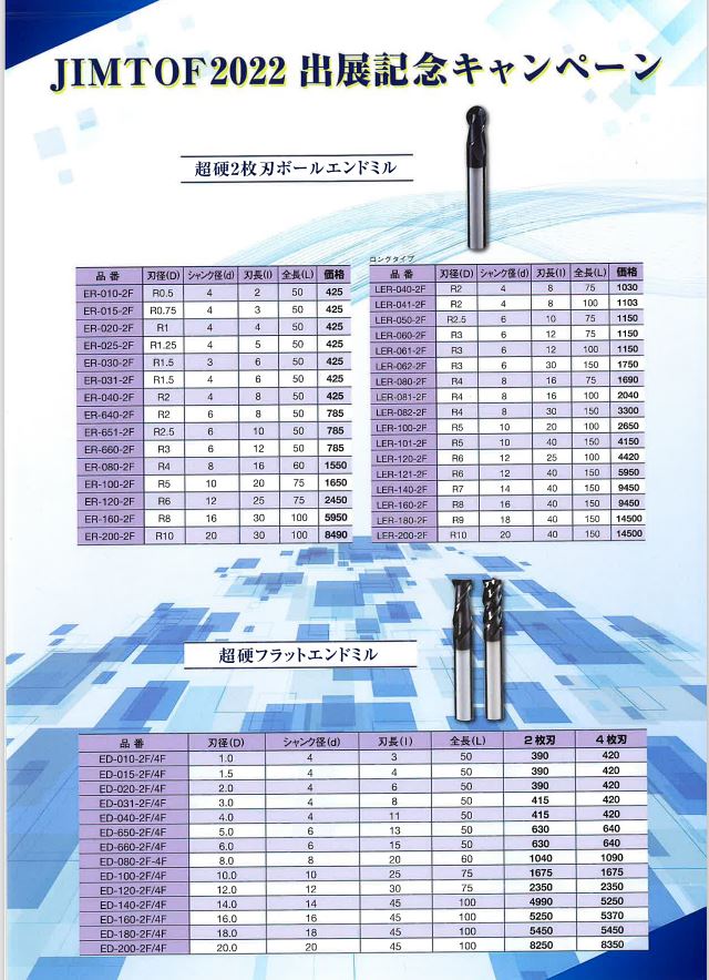 昨年より驚きの低価格で全国デビューした超硬エンドミル。今年はラインナップにロングシャンク、ラフィング、ラジアスを増やし、コーティングにtisnコートも追加。