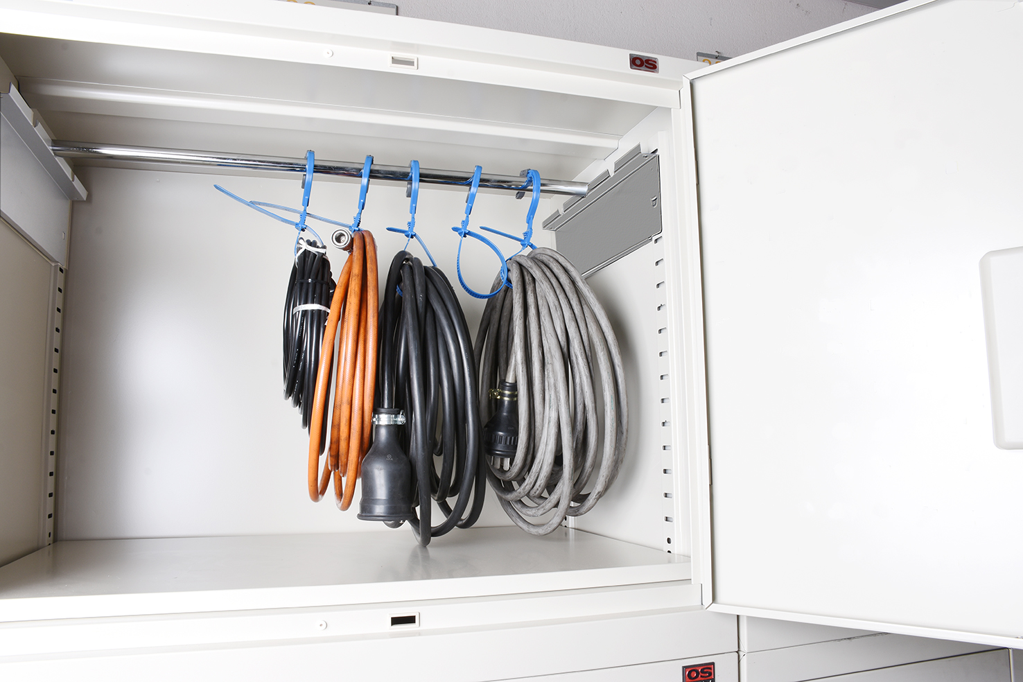 ケーブル・コード類の収納でお困りではないですか?OSケーブル収納フックが解決します!OSロッカーSの外寸間口811mmタイプに装着可。まとめて収納管理が出来て、スッキリ!