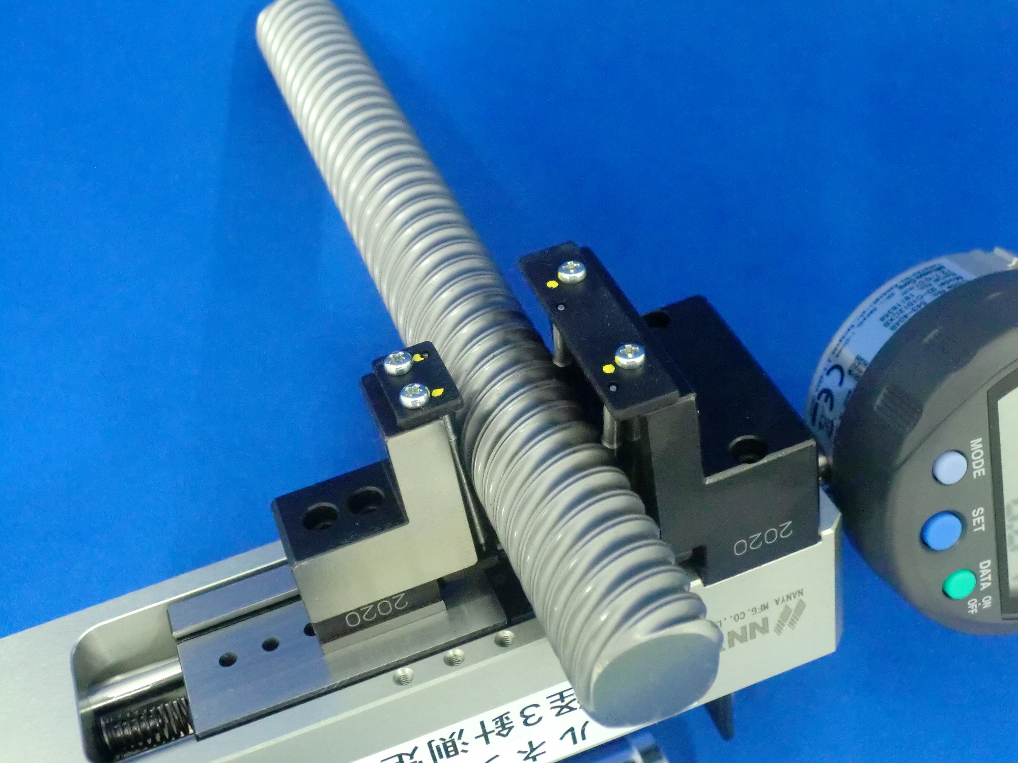 外歯車オーバーピン径測定キャリパ(上) 内歯車オーバーピン径測定キャリパ(下) 製品が小さい場合は設置型キャリパを提案します。 人の手が触らないので製品の測定が安定します。