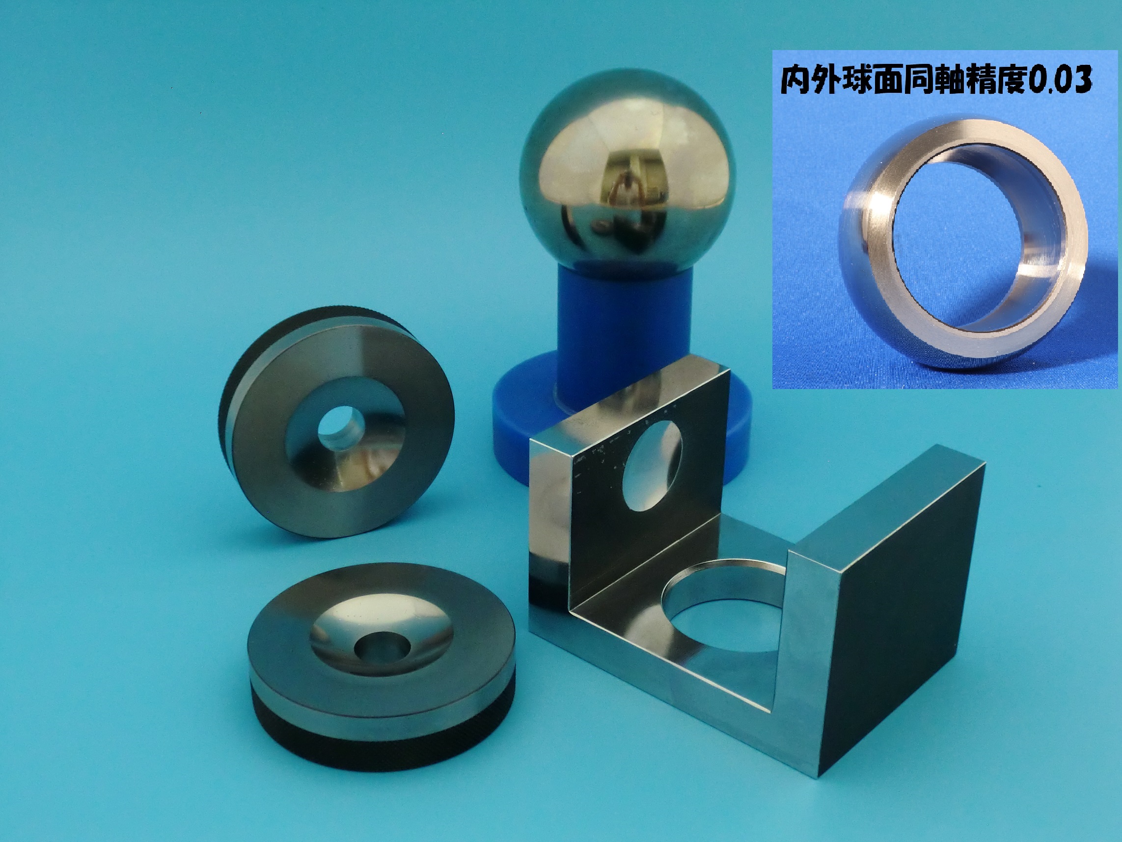 大玉球マスタ(中央) 等速ジョイント(CVJ)用内外球面マスタ(左上) デフケース部品内側の逆球面形状測定マスタ(左下) 球面形状加工は弊社にご相談下さい。