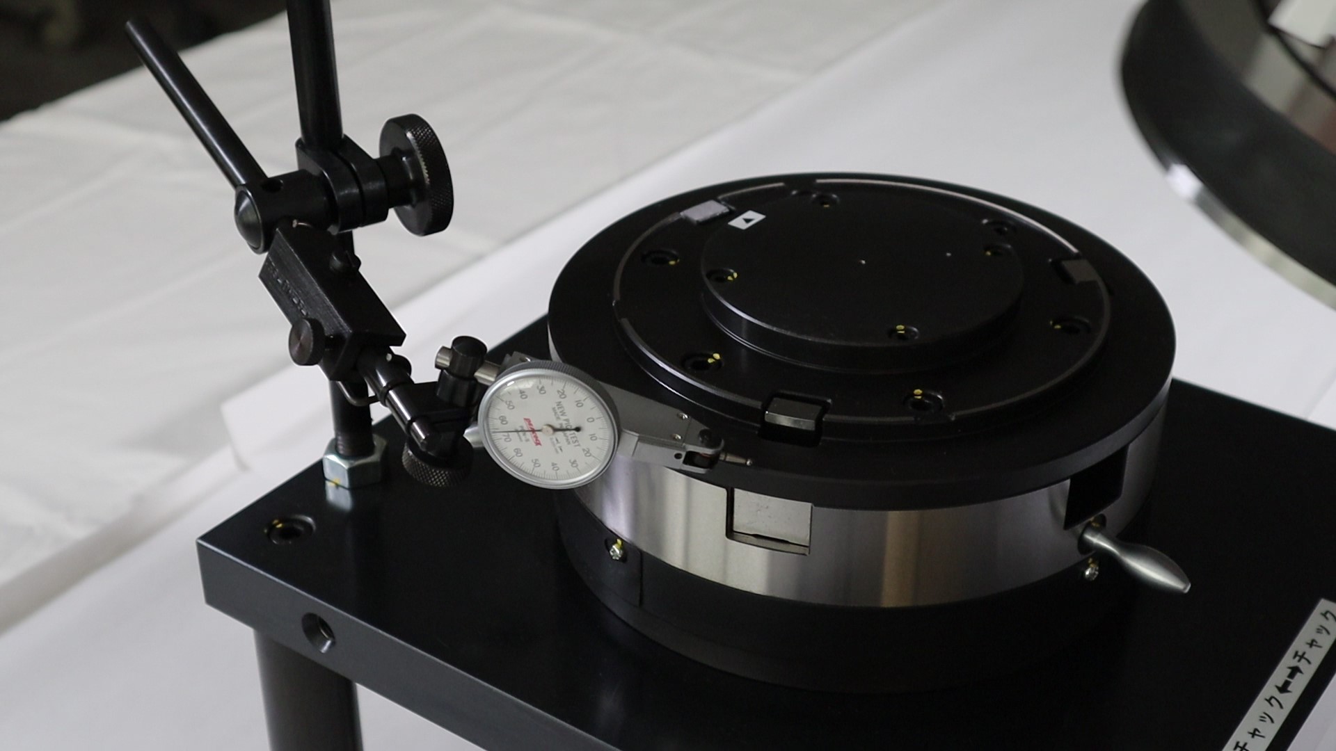 製品基準径の芯を3爪3点チャックで決めて、受け基準面を受けた状態で 回転させて各部の振れ、同軸を測定します。 製品の基準に合わせて専用設計製作します。 生産ラインで測定可能。