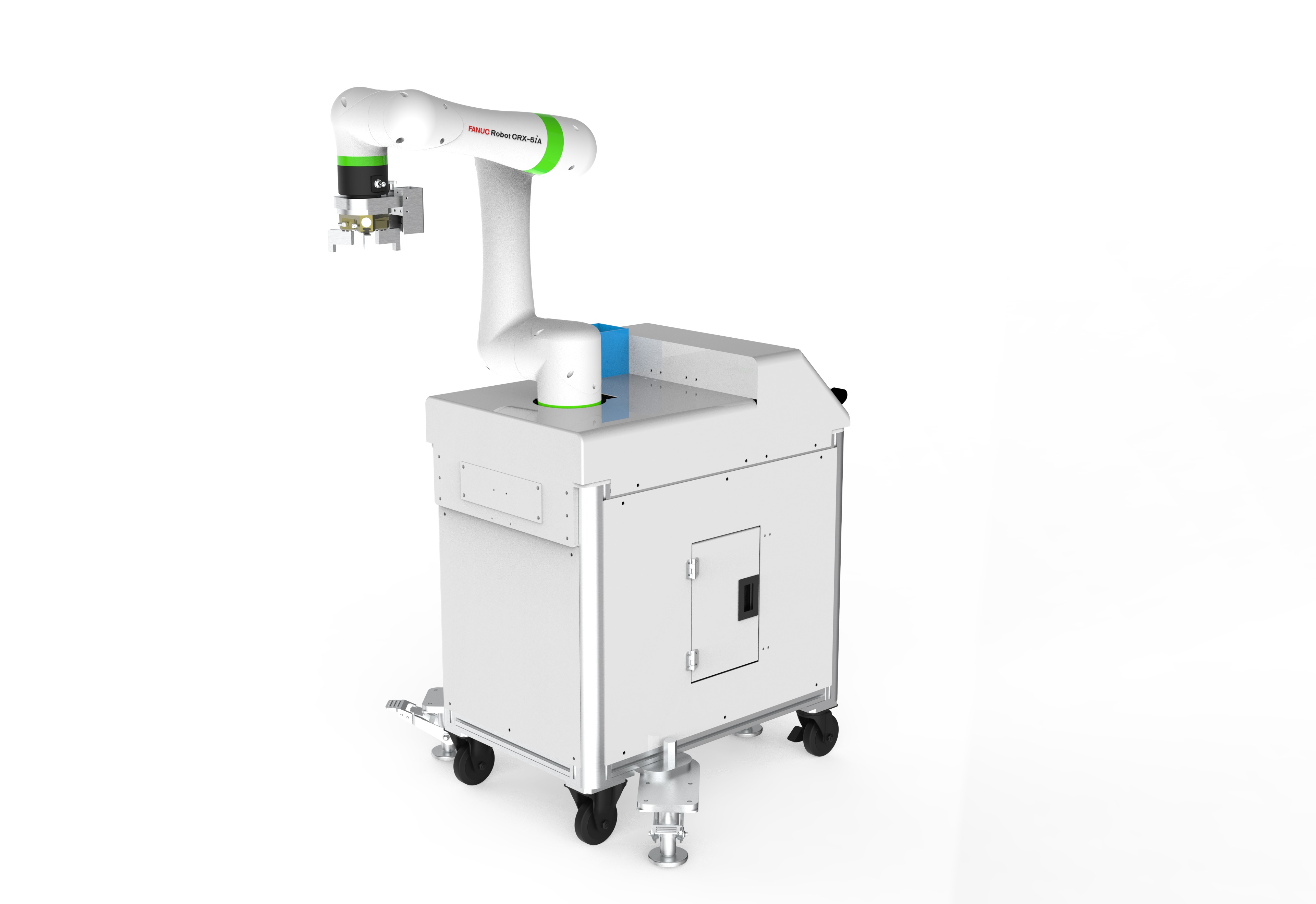 ・ロボ台車: 台車タイプで簡単移動。汎用性が高く、異なる機械に接続し、人手不足に貢献。