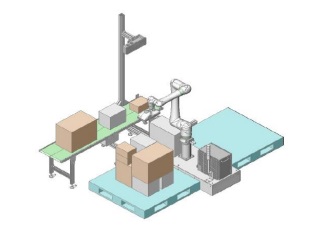Mech-Mind社製AI搭載3Dビジョン:DEEPとFANUC社製人協働ロボット: CRX-25iA/Lによるパレタイジング/デパレタイジングシステムです。