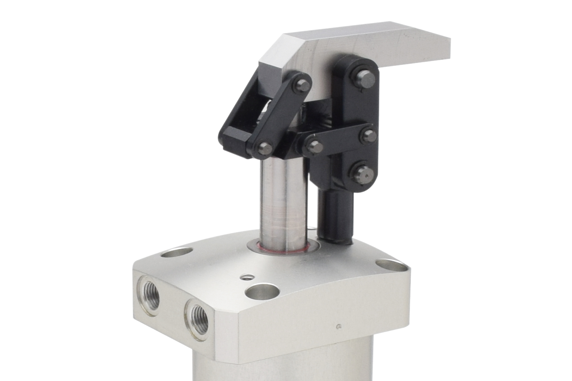 油圧に匹敵する能力をもった倍力機構搭載のエアクランプ。反力に耐える保持力を備え、レバー動作はコンパクトな軌跡かつ大きな退避量。狭いクランプ位置も狙ってクランプできます。