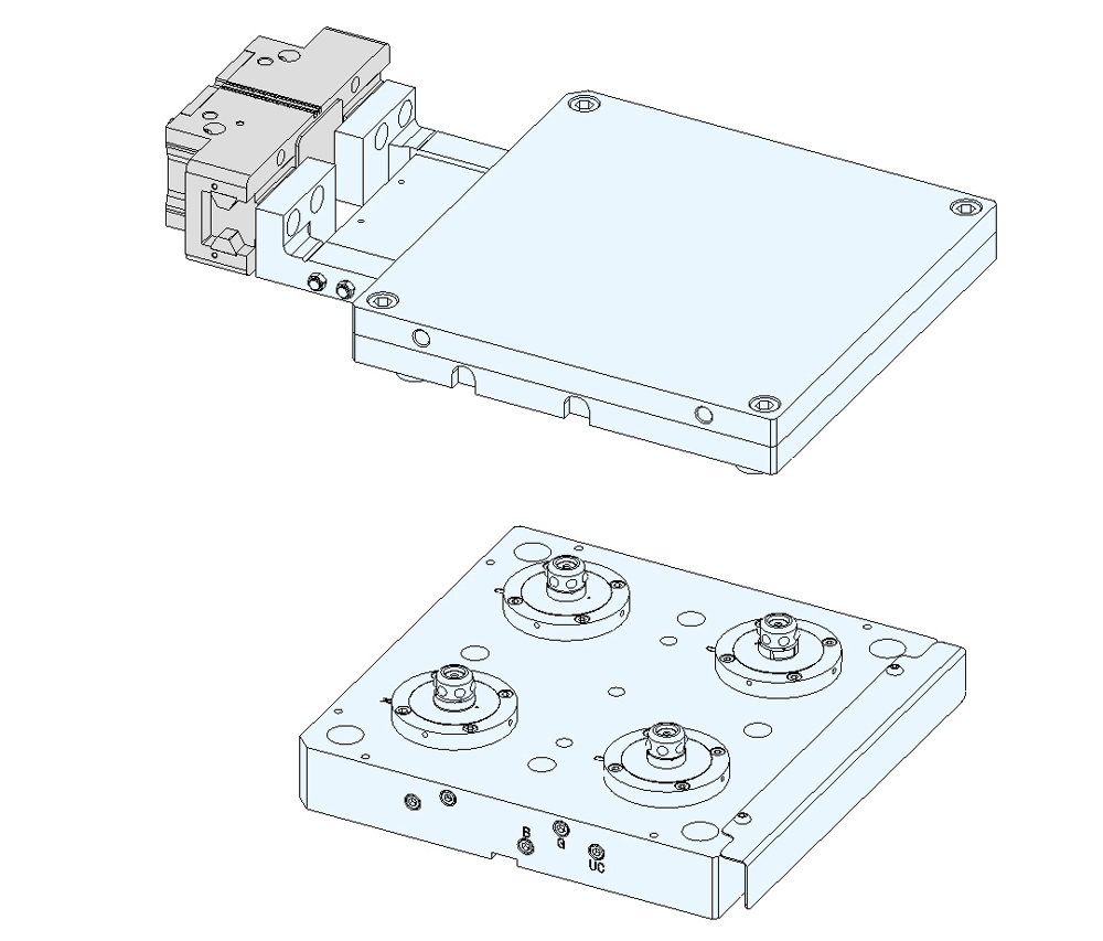 外段取り用の治具プレートをロボット用ハンド爪でクランプ・搬送可能。ワークに合わせた治具の加工から段取り替えを無人化。 機械テーブルへの取付はエアで高精度に位置決め・締結。