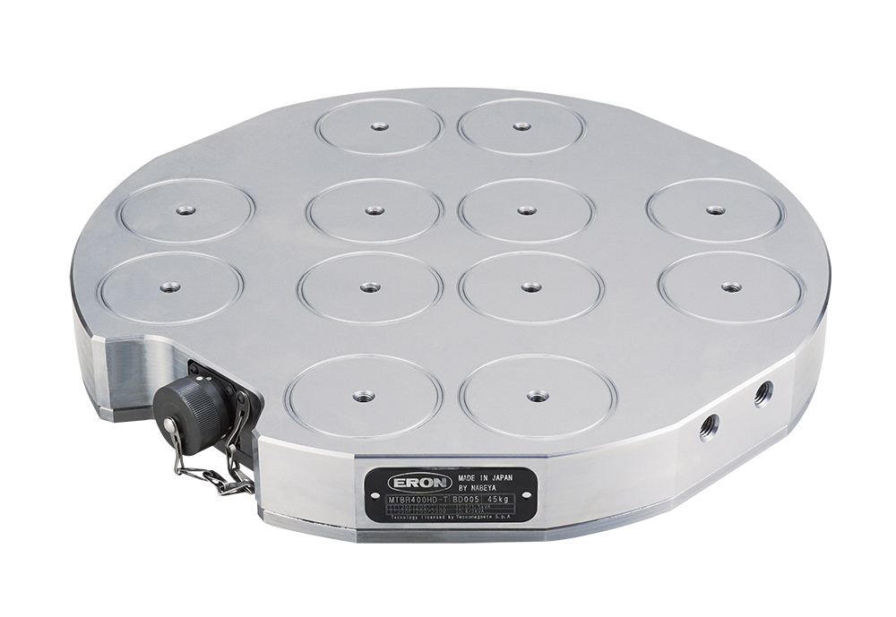 鉄系ワークをワンチャッキングで5面加工。 引込力6150N/磁極φ70で強力クランプで金型の大型にも対応。 加工時はケーブルの切離しが可能。