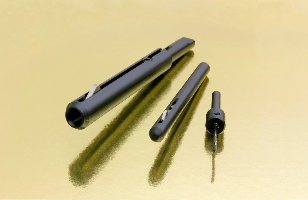 小径穴のバリを取り除くための特別な工具の精密さと効果を強調しています。