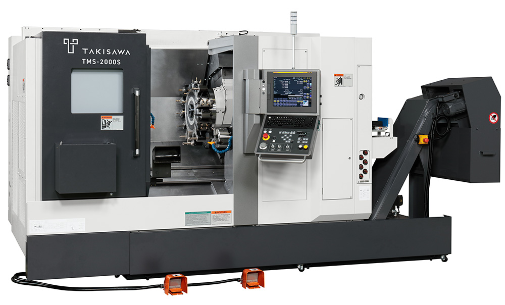 2スピンドル機の新製品2機種を出展。対向2主軸の「TMS-2000S」はシャフト加工を得意とする複合CNC旋盤で、平行2主軸の「TT-2600IIG」は量産加工を得意としている。