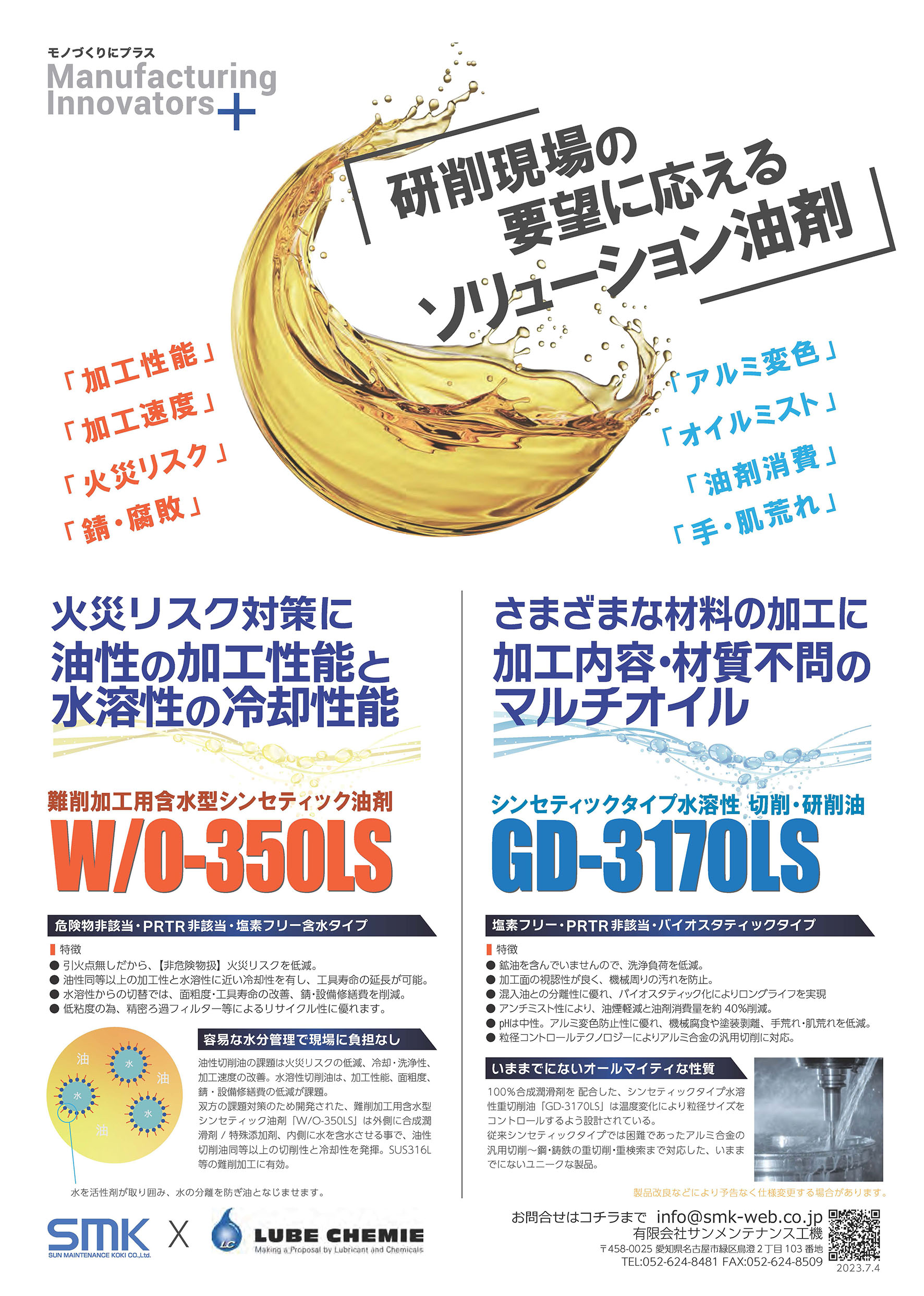 加工性能、加工速度向上。火災リスク、錆・腐敗低減―W/O-350LS。アルミ変色、オイルミスト、手や肌荒れ対策にGD-3170LS。現場の要望に応えるソリューション油剤。