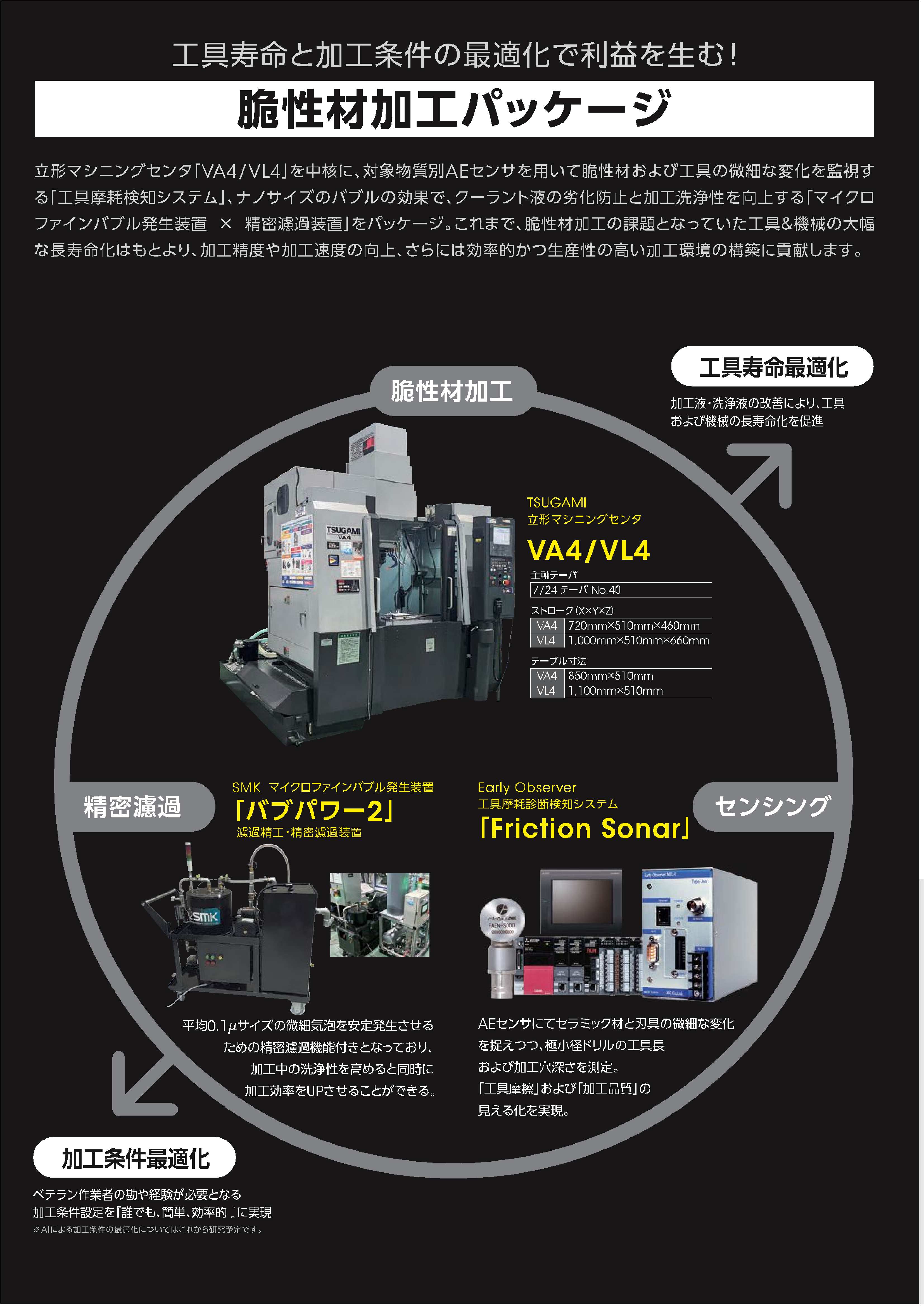 加工環境ソリューションは、脆性材加工における課題解決できるソリューションである。マイクロファインバブル(バブパワー2)や精密ろ過装置、センシングシステムを効果的に「つなぐ」ことで、品質向上や稼働の安定を図り、利益を生むスマートファクトリー化の実現に貢献する。