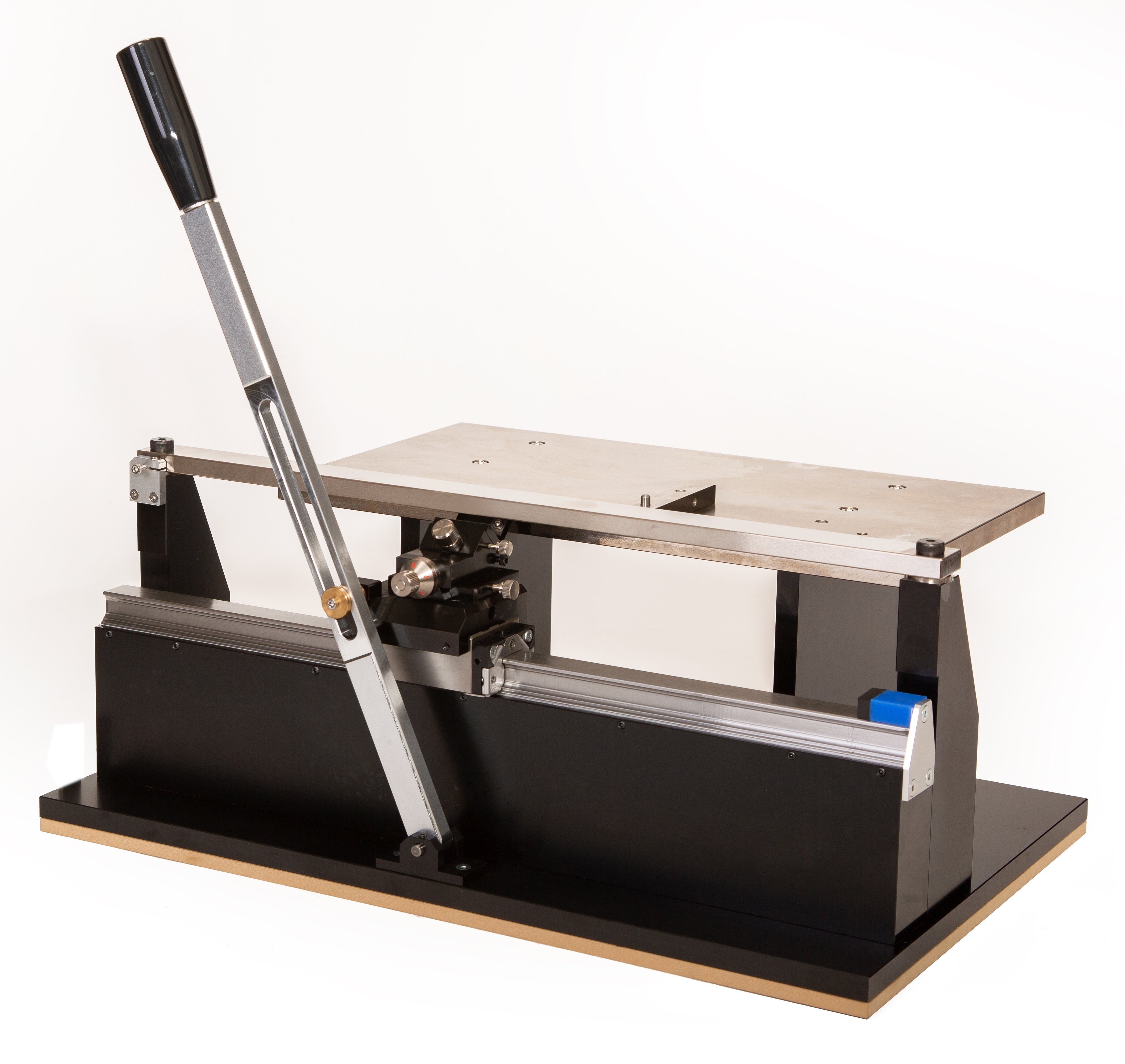 アルミ・樹脂 用の卓上面取り機。電力不要、騒音ゼロで切粉の飛散もなし。手動でも高速高精度。50×50×20mmのブロック 12 稜 を 30 秒で面取り可能。面取り長 150mm。