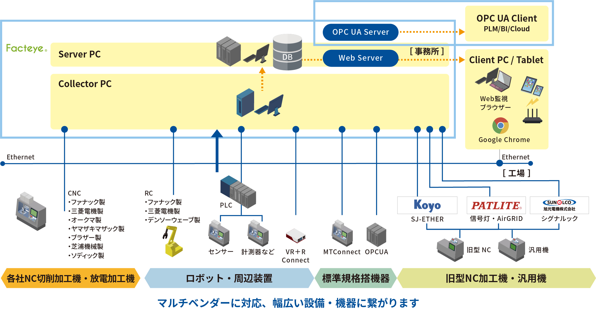 各社NCコントローラーと直接接続し、 生産設備の稼動データをリアルタイムに自動収集、監視するシステムです。 アラーム発生時の主軸負荷などの分析で予防保全を支援いたします。