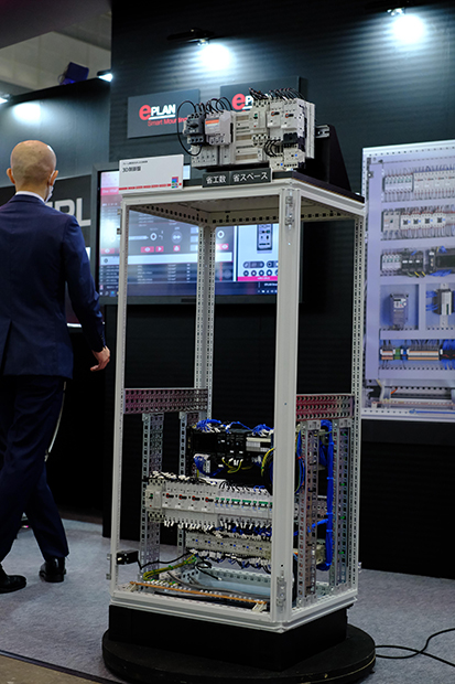 また、電気設計CAD EPLANとのデータ連携ソリューション「VALUE CHAIN(バリュー・チェーン)」の提案として、制御盤の設計・製造・メンテナンスがどのように自動化し、効率的に行えるのかを各工程ごとに映像で紹介。