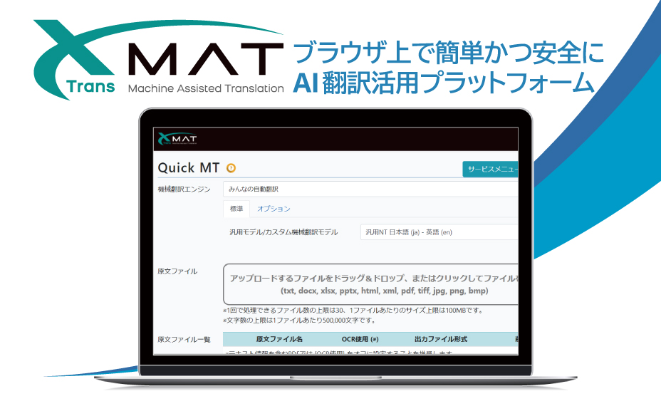 このような課題に、AI翻訳活用プラットフォーム「XMAT」や、翻訳サービス「AI翻訳+ポストエディット (機械翻訳の出力結果に人が確認・修正して仕上げるサービス)」を提案する。