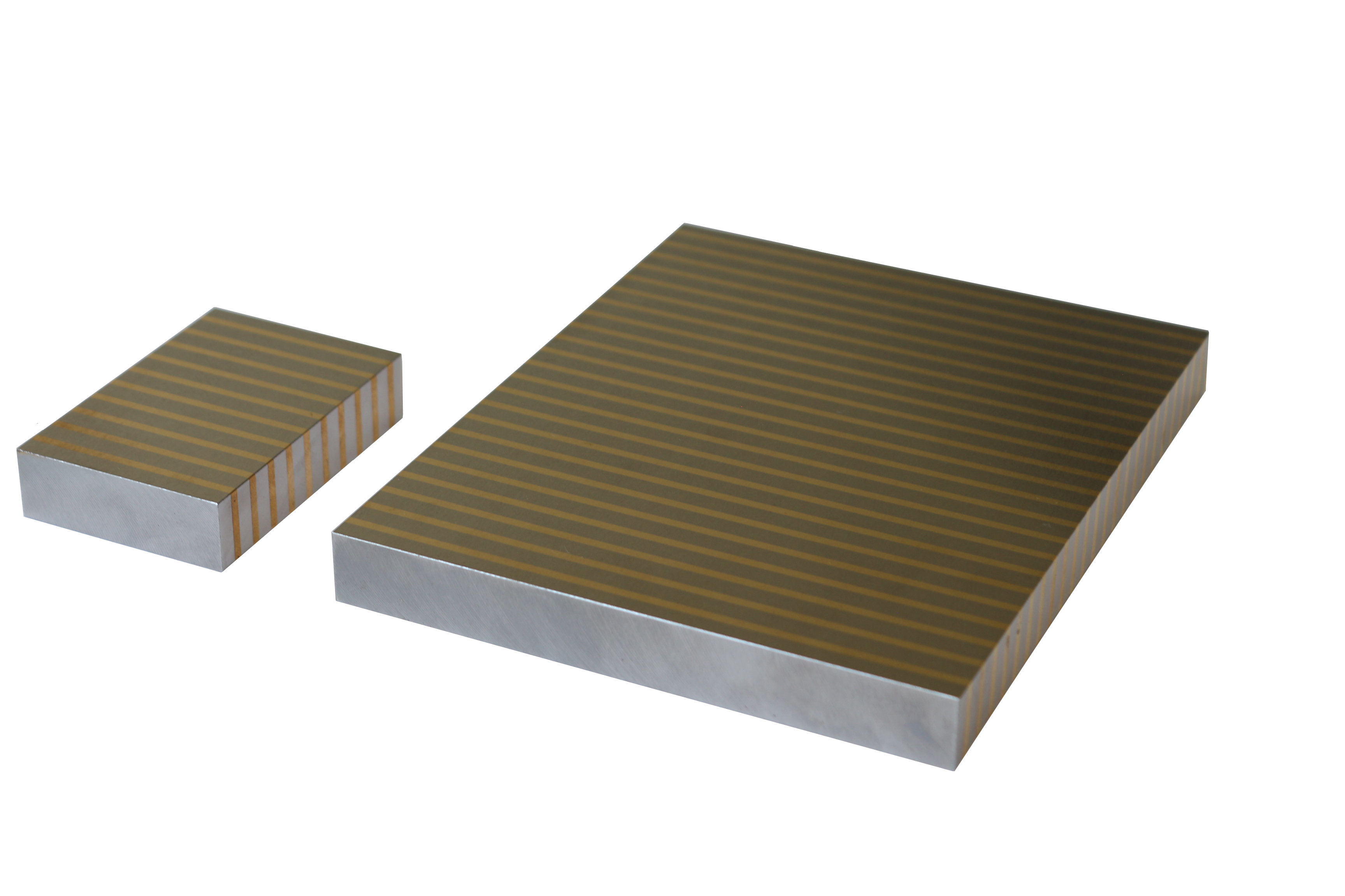 ③シンチャックブロック(仮称)は2種類の金属を強固に直接結合する技術を採用し、本体への自由な追加工を可能にした。ろう材やボルト類を使わず従来不可能であった薄さを実現、磁力のロスを抑えワーク固定の一助として今まで以上に活躍する。使用部材を最小限に留め、環境に配慮したエコなチャックブロックが誕生。